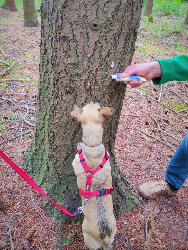 - Ist die Paste an einem oder mehreren Bäumen verteilt, lässt Du Deinen Hund alles in Ruhe abschnüffeln und abschlecken. Anfangs kannst Du ihm gern helfen und mit dem Finger zeigen, wo die Paste genau ist. Er wird sich über diese Art des Teamworks garantiert freuen.
